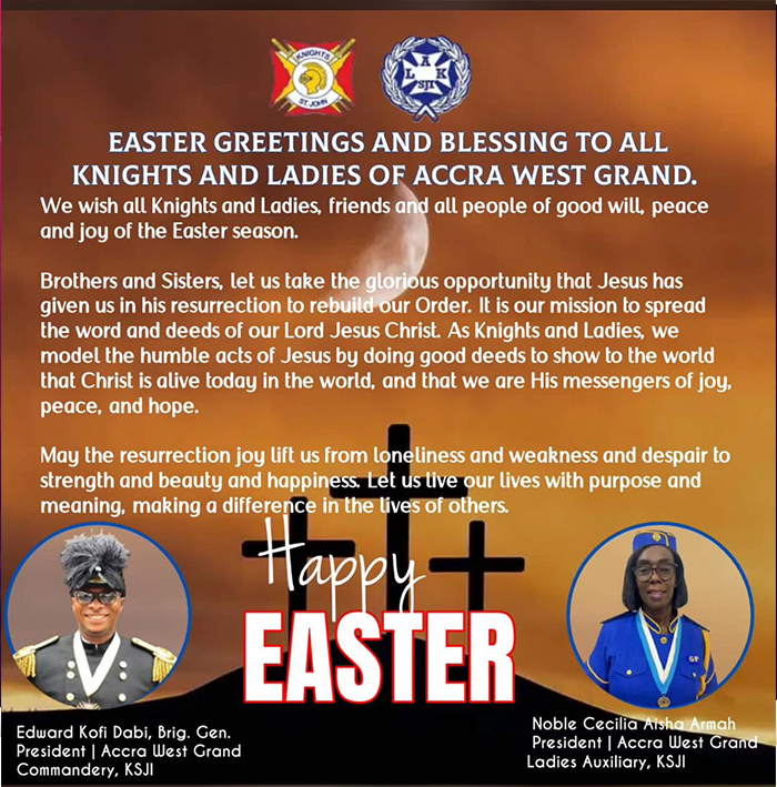 Discover the essence of faith, service, and fraternity with the Knights of St. John International (KSJI) Accra West Grand Commandery & Ladies’ Auxiliary. Nestled in the heart of Accra, we epitomize a vibrant community deeply rooted in Catholic tradition. Our mission is simple yet profound: to live the Gospel through action. Through a myriad of charitable endeavors, spiritual initiatives, and communal services, we strive to make a tangible difference in our beloved community.
